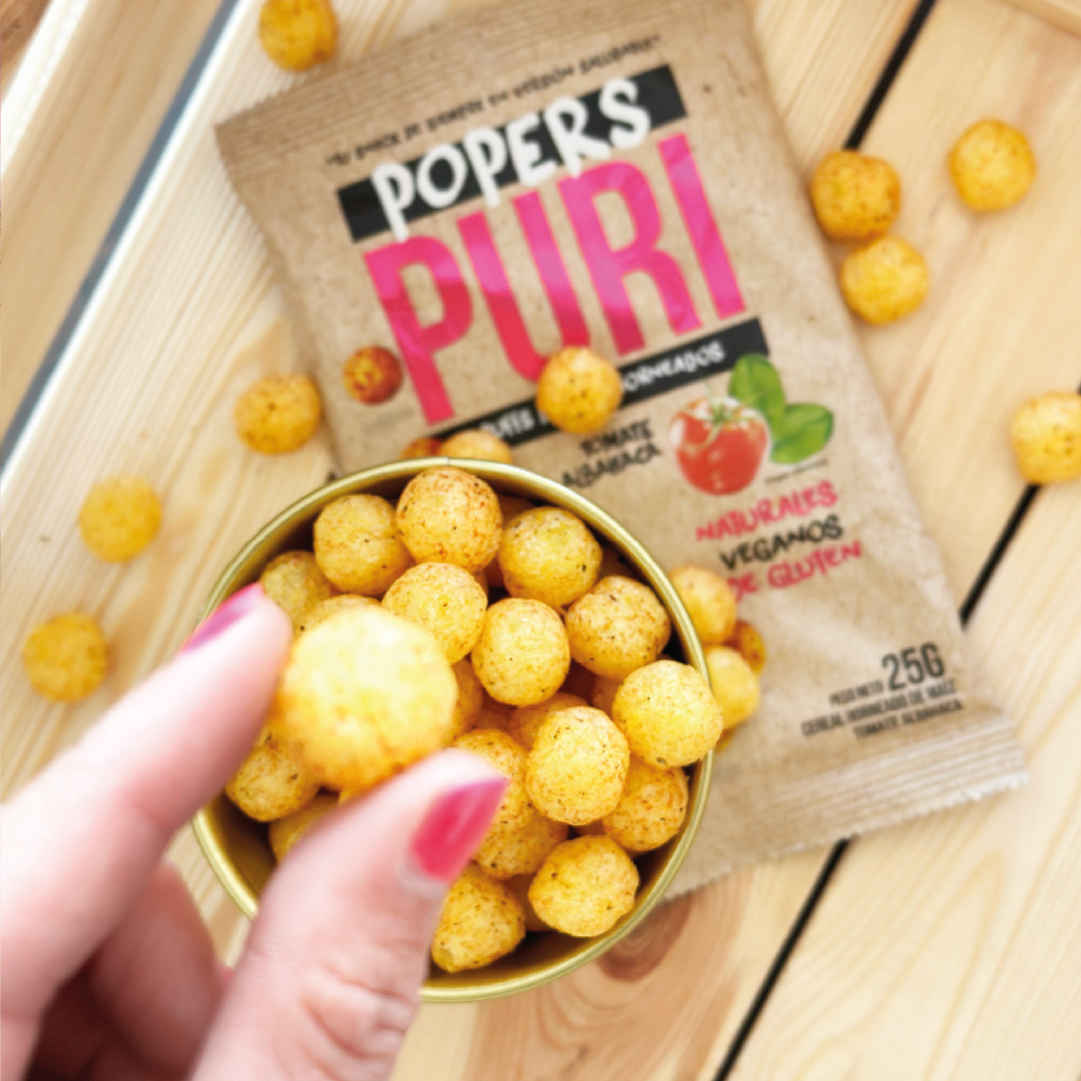 Puri Popers vienen en 2 sabores irresistibles: Tomate Albahaca y Chocolate.